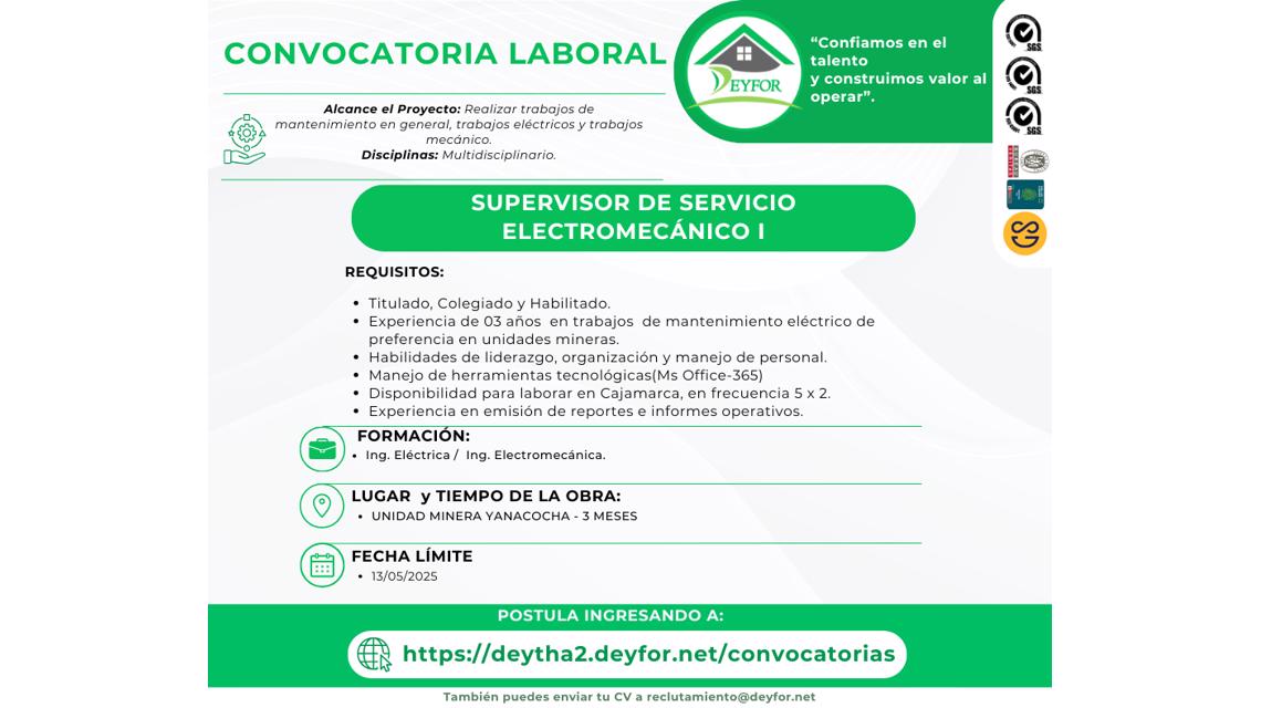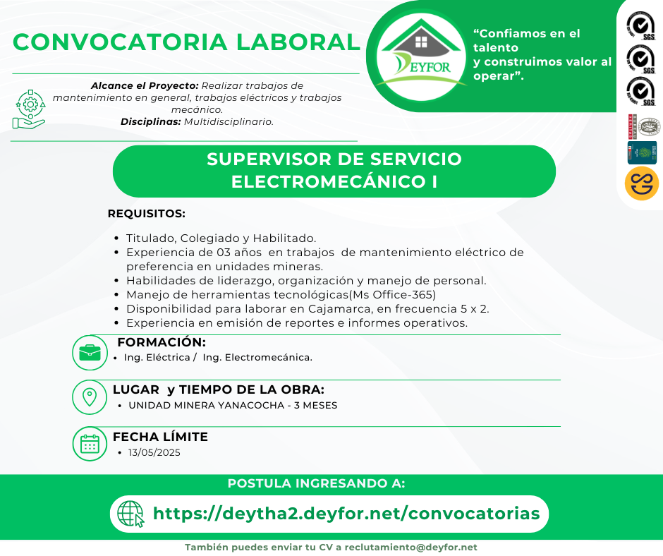 - Experiencia de 03 años en trabajos de mantenimiento eléctrico de preferencia en unidades mineras.